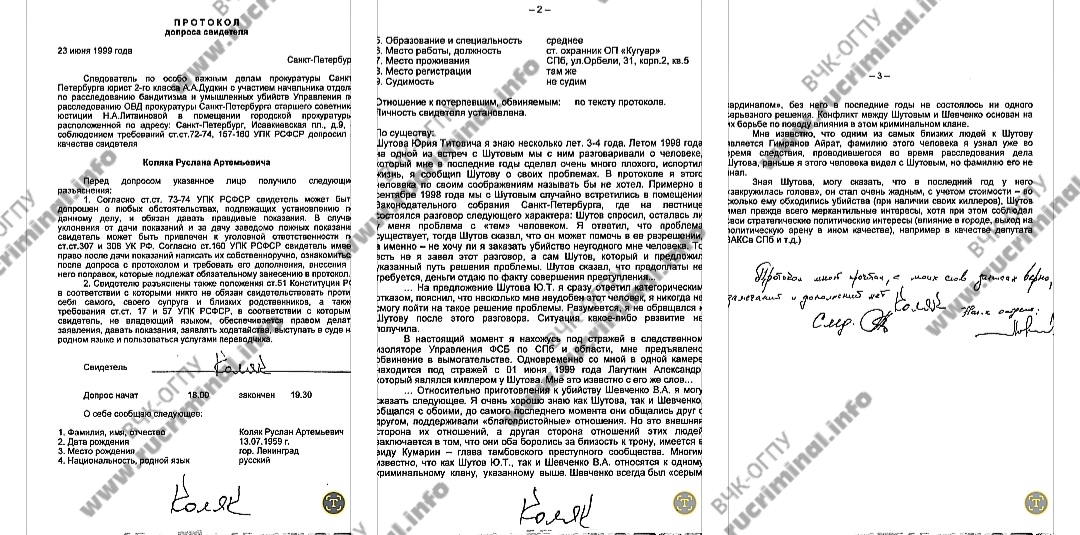 Сейчас бывшего лидера тамбовской ОПГ готовят к тому, чтобы на него окончательно повесить убийство Маневича и показания Гимранова (а он всегда был готов говорить, что скажут, только не правду) будут как нельзя кстати. Тем более, другой герой «бандитского Петербурга» Руслан Коляк (убит на ялтинском пляже в 2003 году) давал показания (см скрин), что Шутов был крайне близок к криминальному «трону», на котором тогда восседал Кумарин, а его самой близкой связью называл Гимранова.